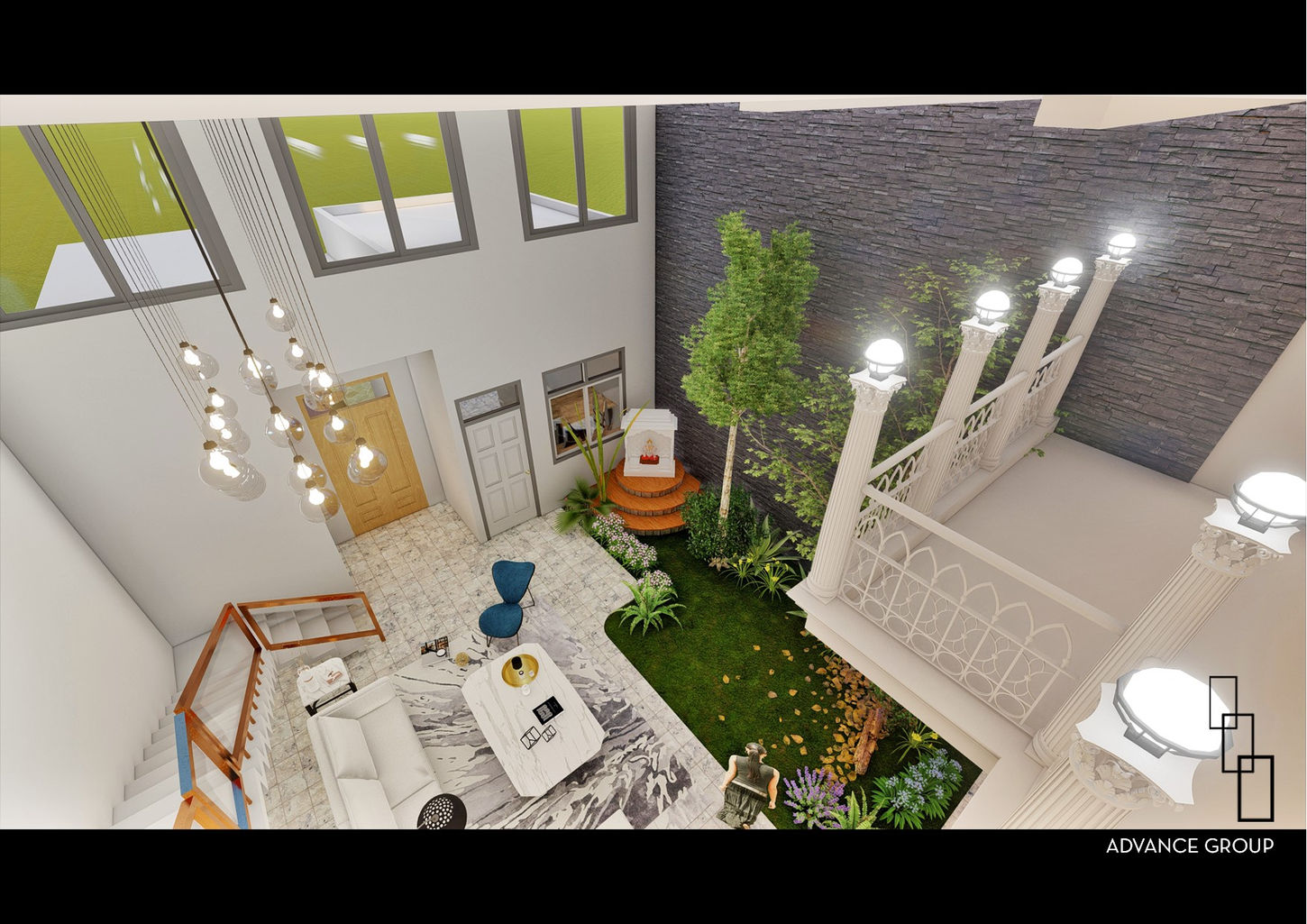 The first floor, for their daughter and grandchildren, is visually connected to the rest of the house through a central courtyard, creating interaction and harmony. Inspired by palatial architecture, the design links levels vertically to foster family unity.